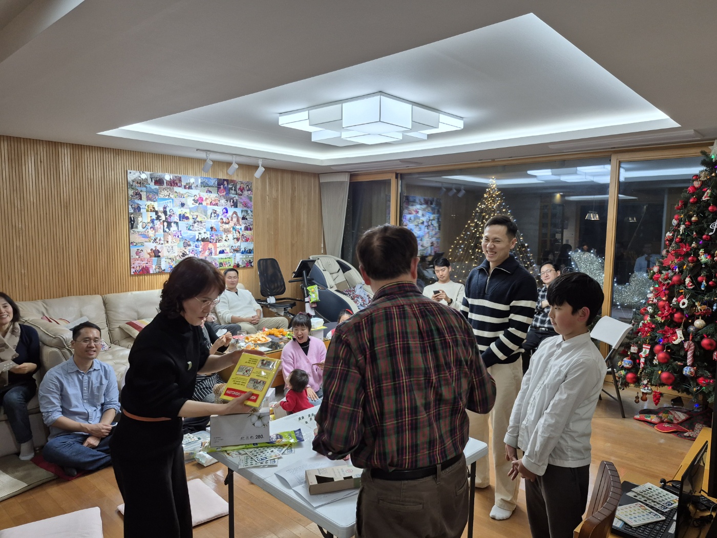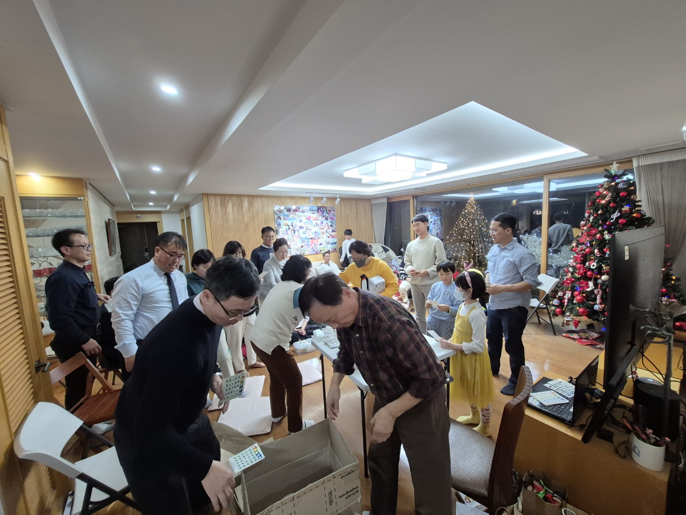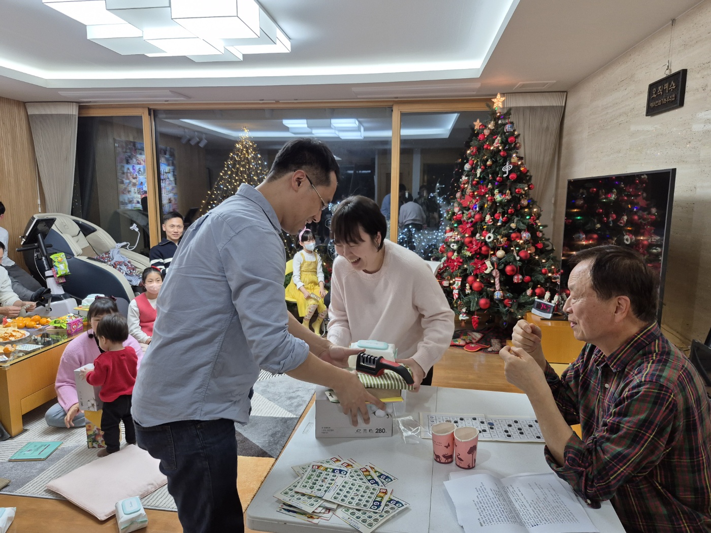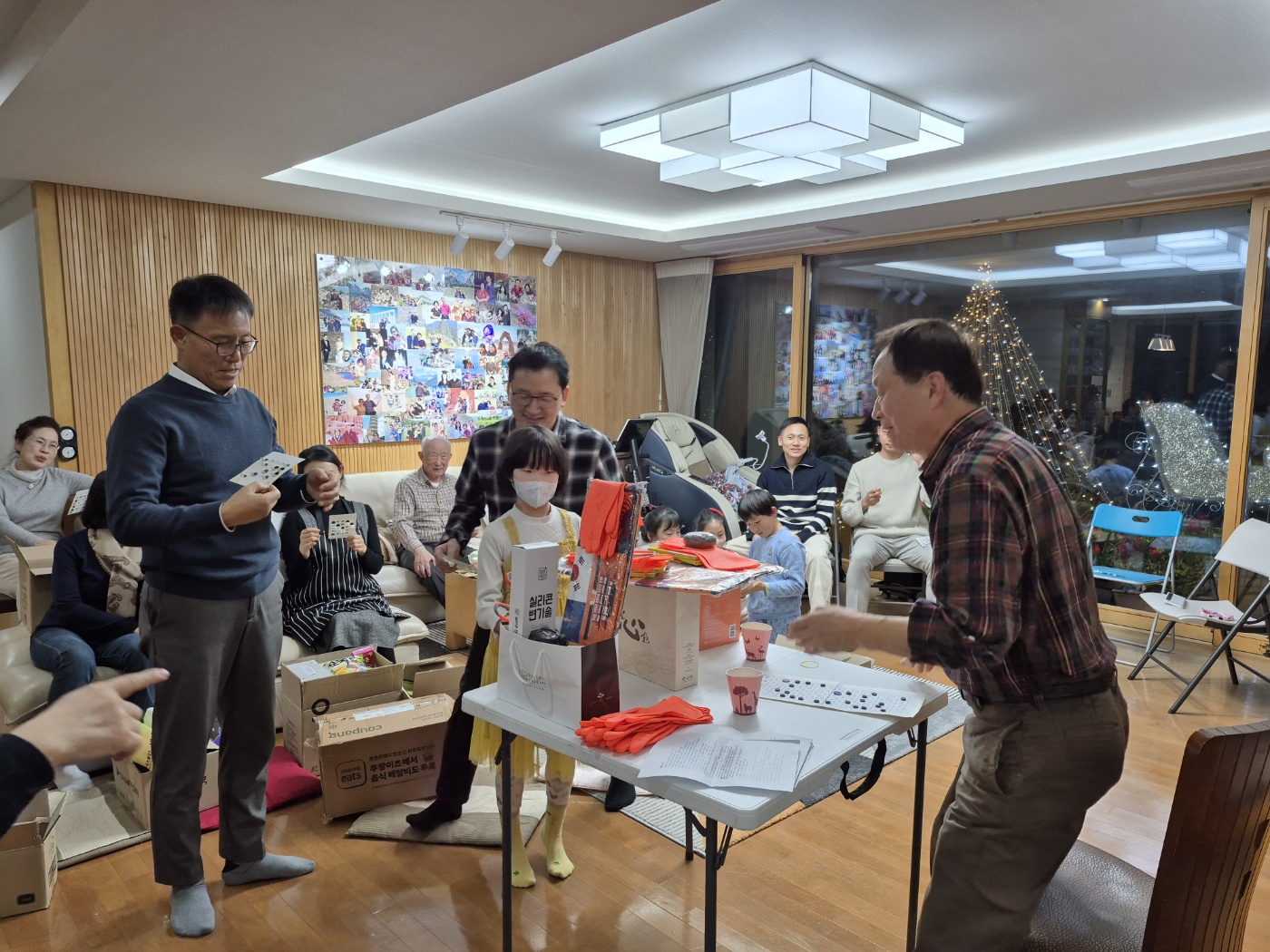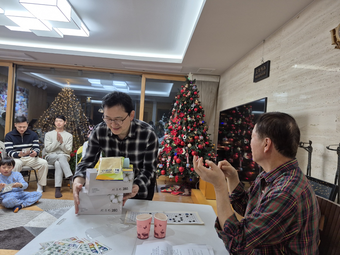 "빙고 안 된 분들 그 자리에서 다 일어나 보세요" 하고 기본 선물을 일단 하나씩 손에 안깁니다.