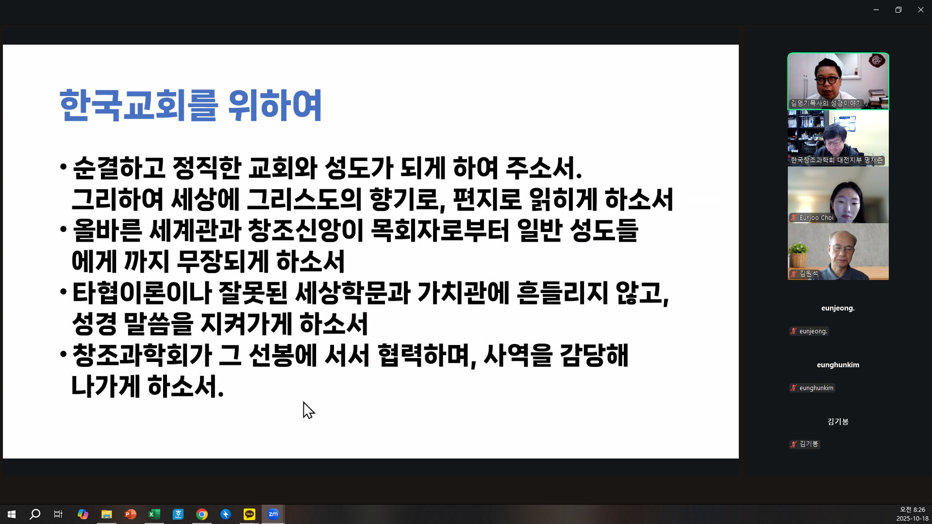 오랜만에 김영기 목사께서 참석하여 예배를 인도하며 기도회를 진행하였고, 김기봉 회원께서 "유신진화론 완벽 이해하기"라는 주제로 스터디를 진행했습니다.