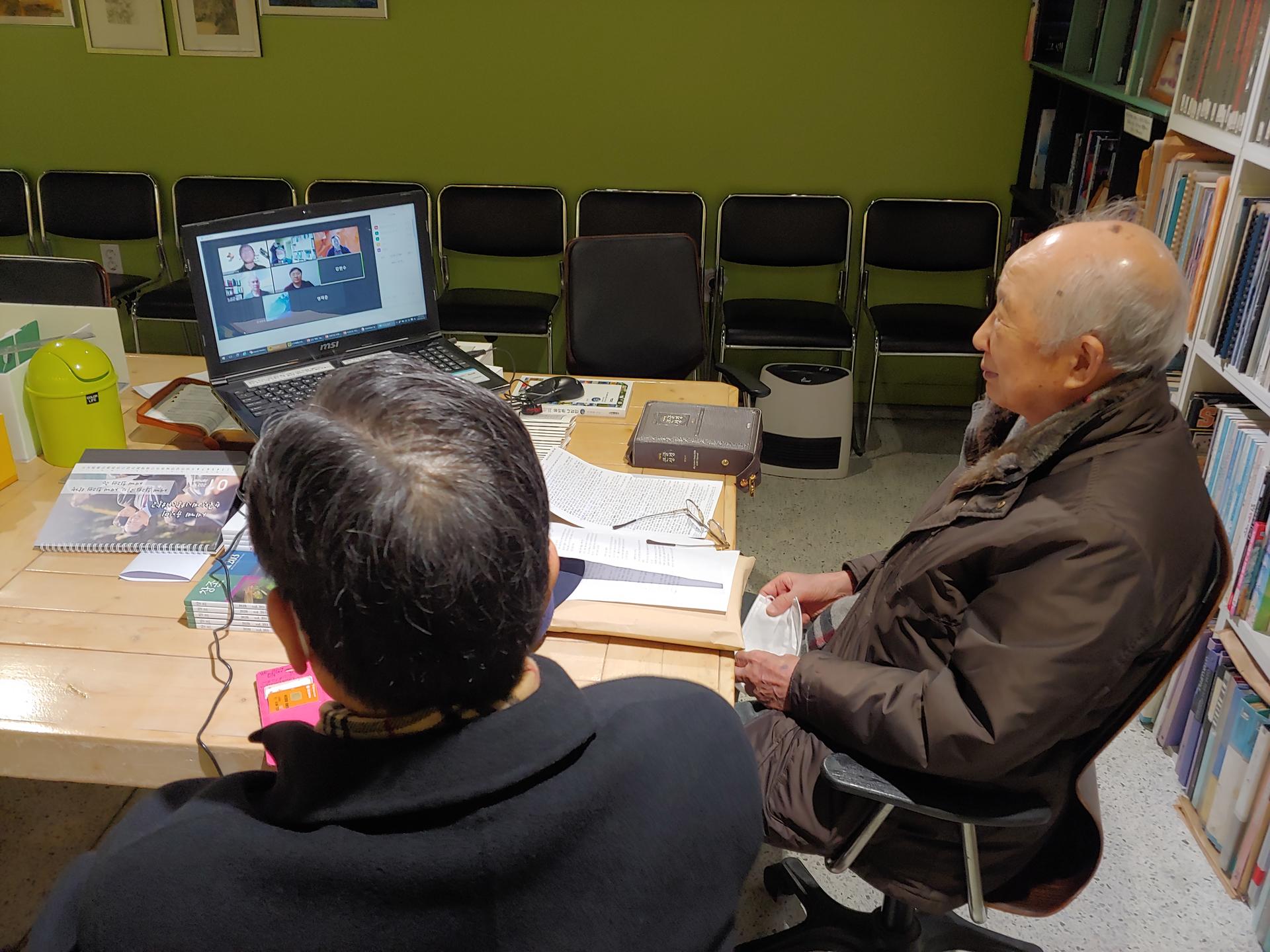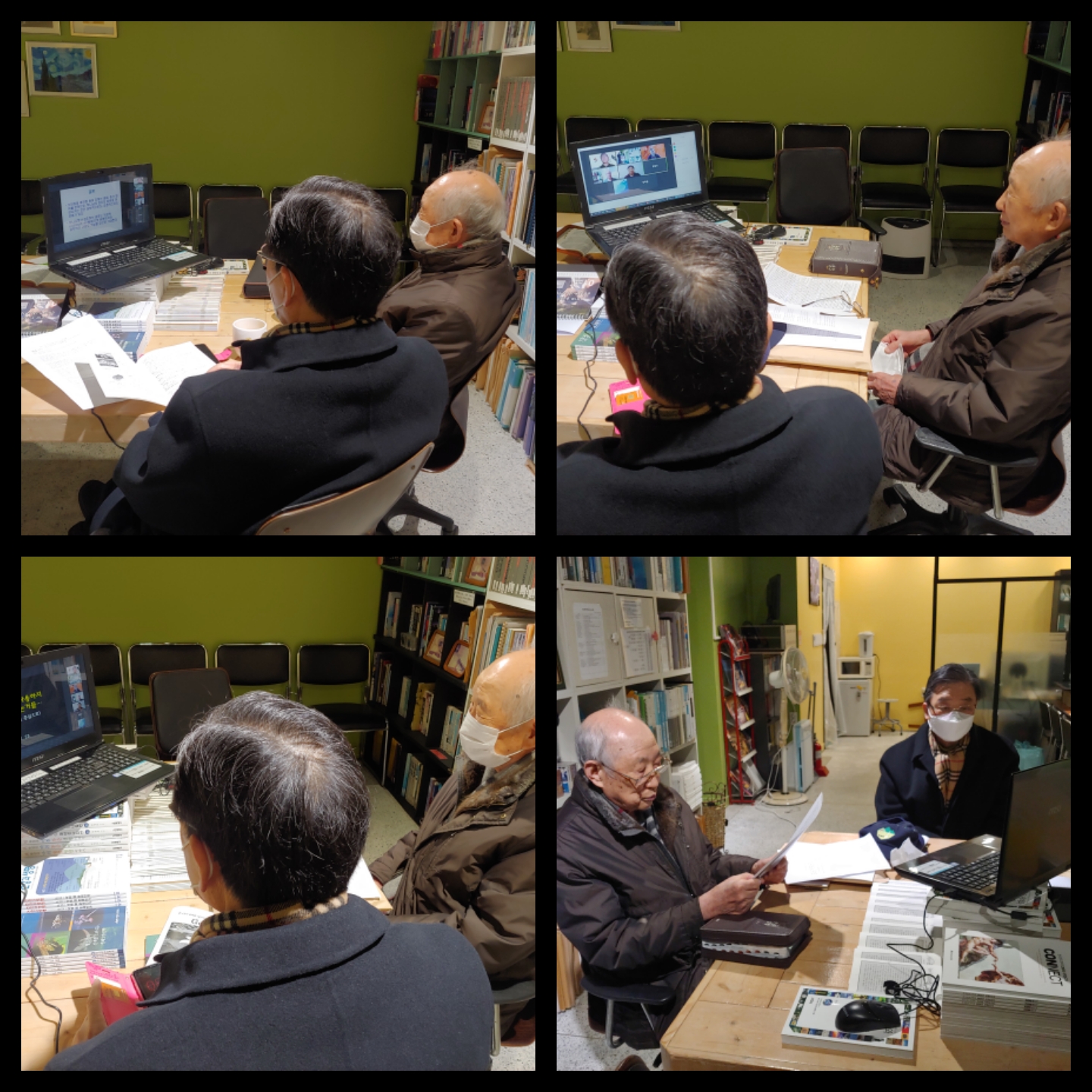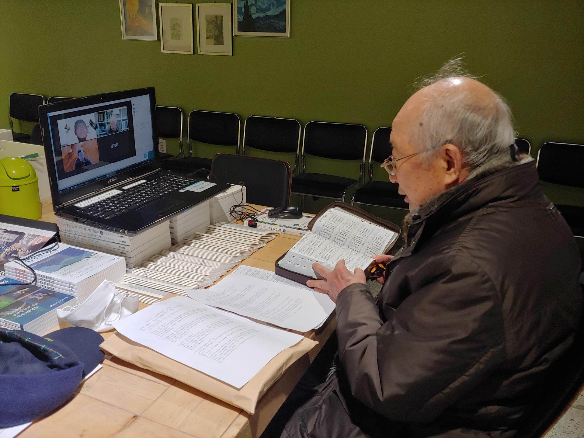 예배드리는 중에 한분 두분 추가 접속하시고, 송기범 회원은 zoom이 잘 안된다시며 세미나실로 나오셔서 셋이 함께 모임에 참여하였습니다.